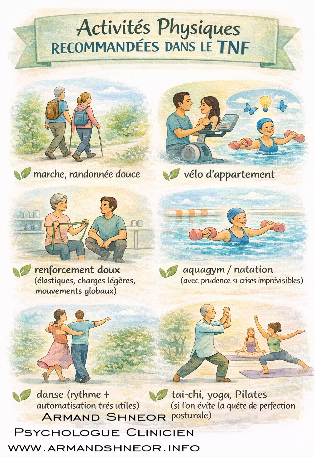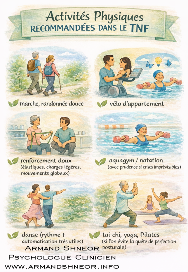 La littérature scientifique récente rapporte que l’activité physique dans le TNF fait l’objet d’études en développement, avec des leçons à tirer des comorbidités fréquentes (douleurs, fatigue, troubles anxieux, etc.) et de la façon dont elles modulent la tolérance à l’effort. (1)